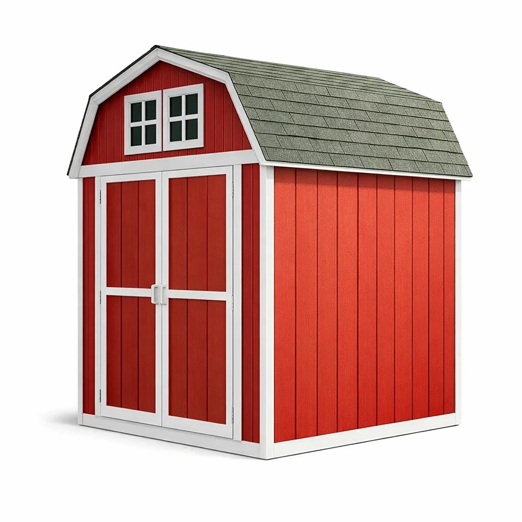 Il capanno da giardino è realizzato in legno verniciato con un tetto in tegole di asfalto.
