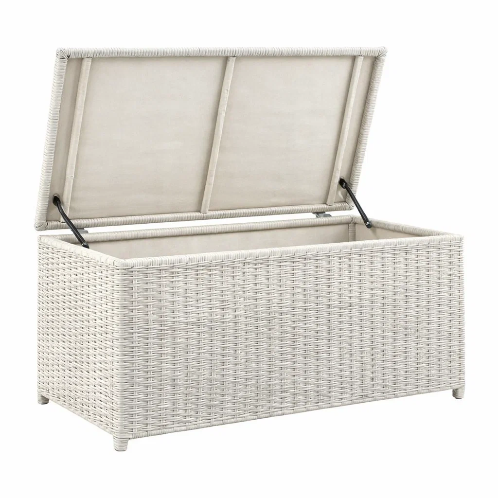 Questa cassapanca è realizzata in rattan sintetico con struttura interna in acciaio per garantire resistenza e durata. Offre un ampio spazio di stoccaggio adatto a vari ambienti esterni.