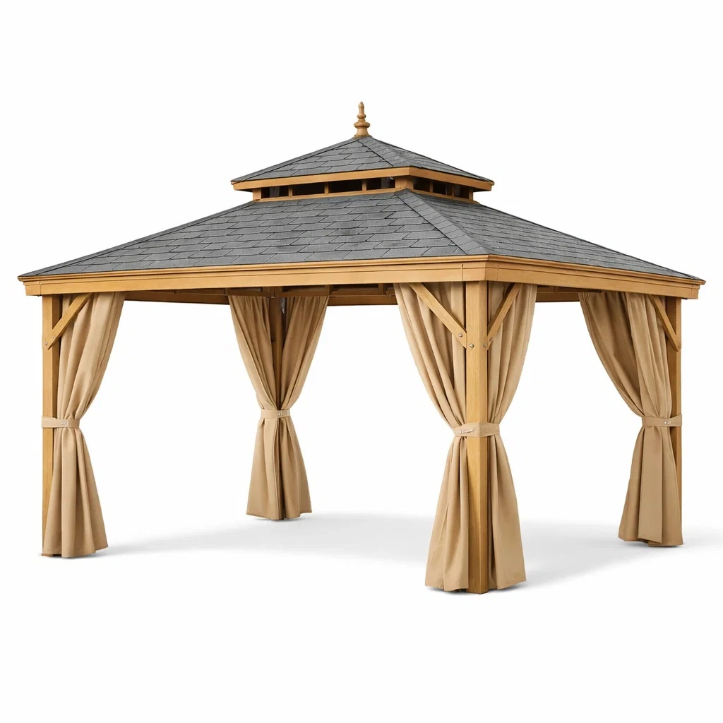 Gazebo in legno con tetto in tegole bituminose e tende in poliestere