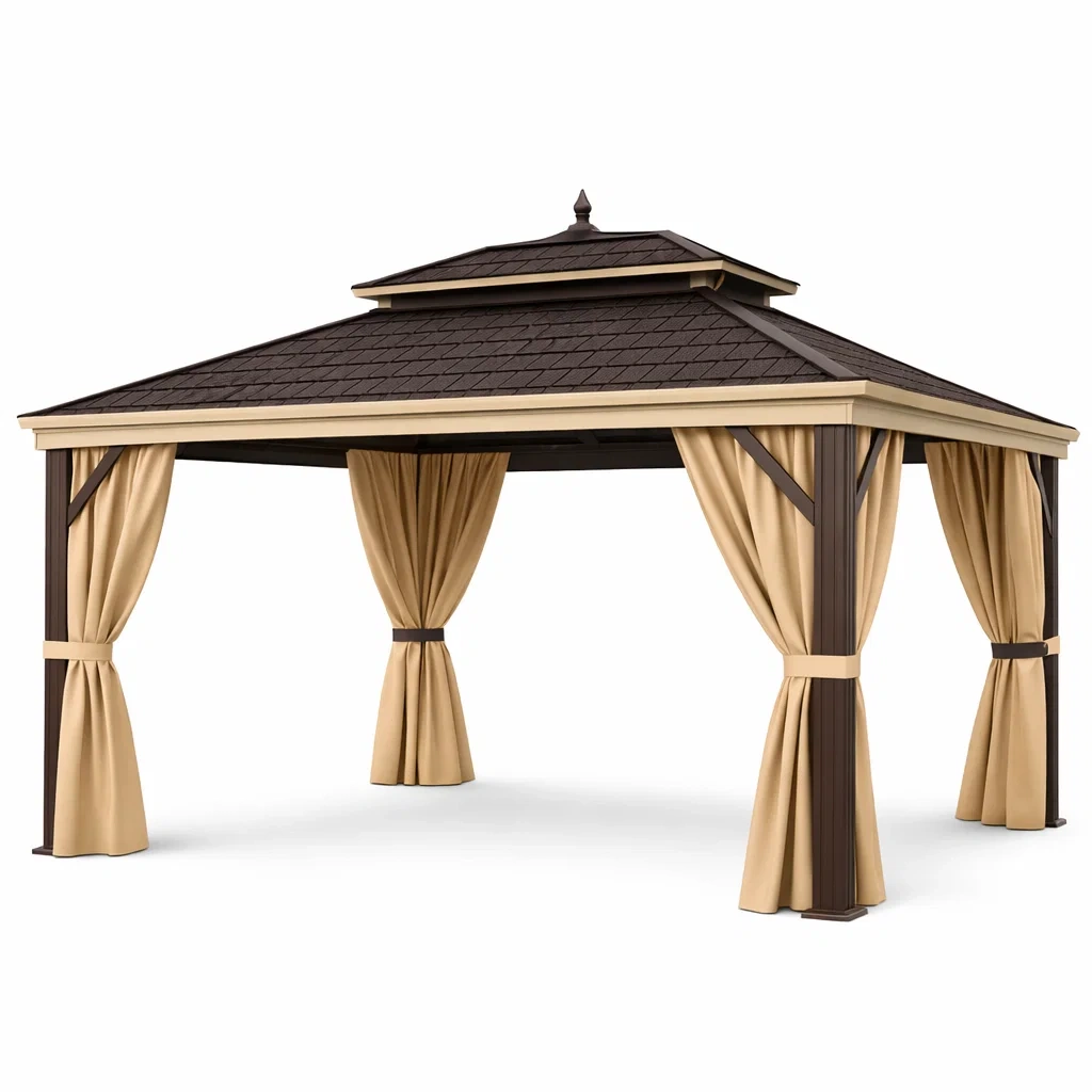 Struttura in alluminio verniciato a polvere. Copertura in tessuto poliestere resistente agli agenti atmosferici. Tende inclusi.