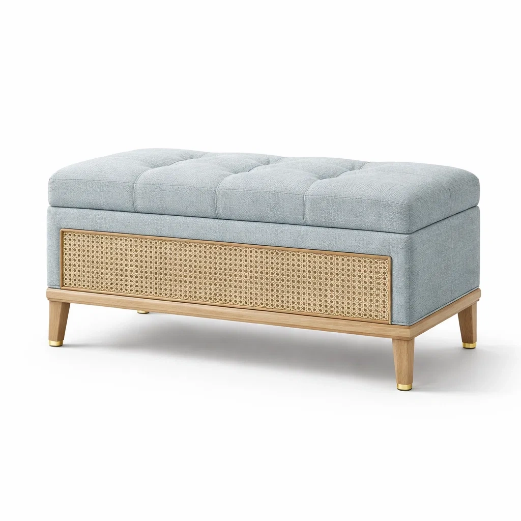 Panca contenitore in legno e rattan con rivestimento in poliestere grigio chiaro