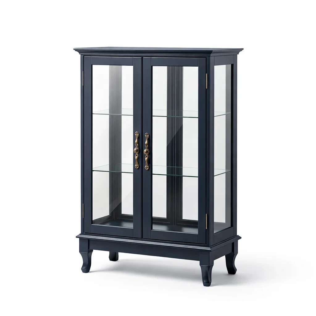 Questa vetrina è realizzata in legno massiccio con ante e ripiani in vetro temperato da 6 mm, offrendo un'esposizione chiara e accesso visibile agli oggetti all'interno.