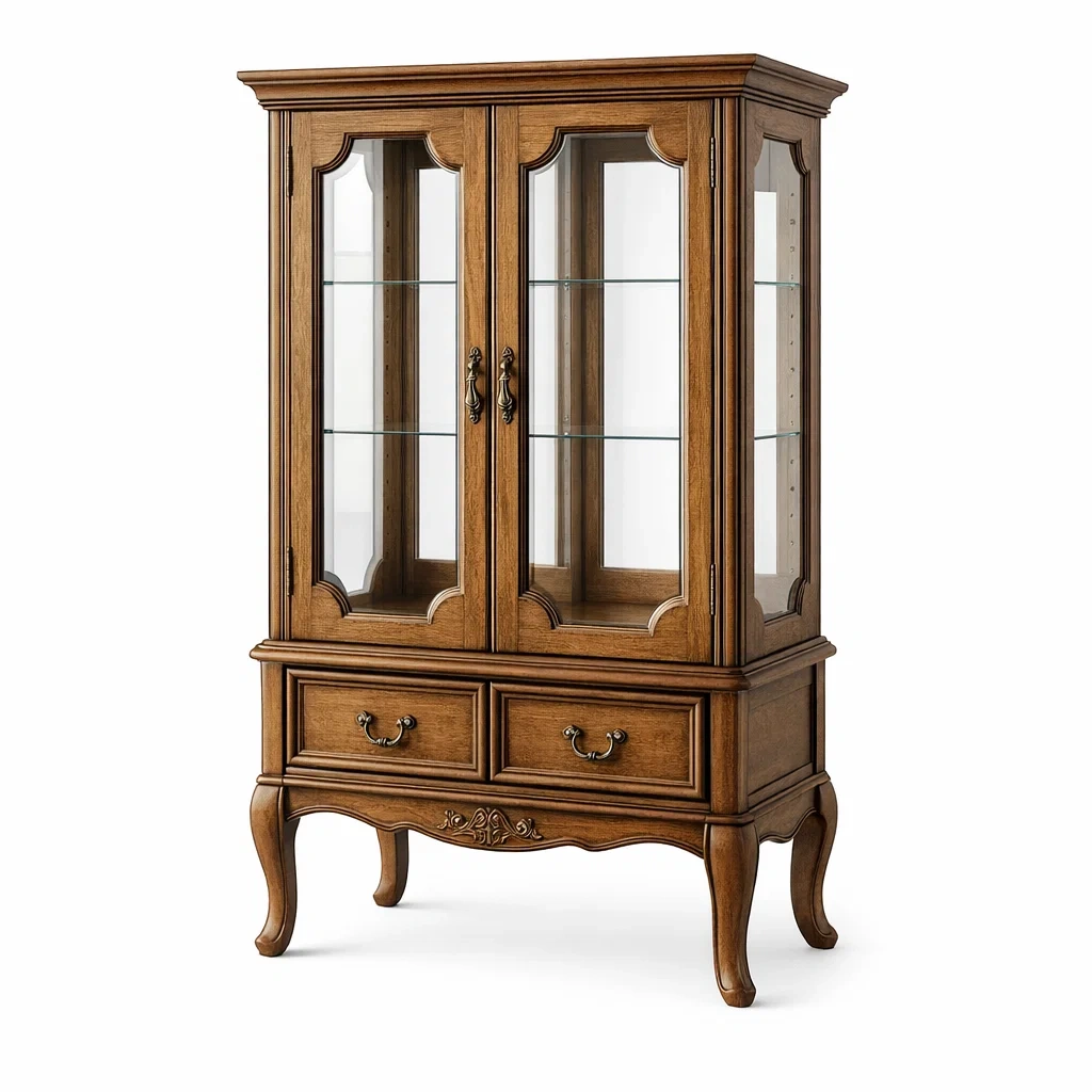Vetrina in legno con ripiani regolabili in vetro temperato e finitura in noce.